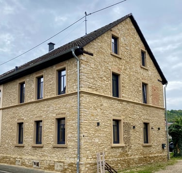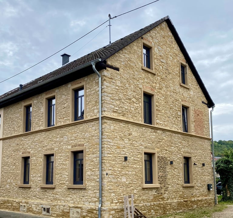 Das Haus aus der Jahrhundertwende war seit Jahren unbewohnt und in schlechtem Zustand. Die Bauherren entschieden sich trotzdem zu Kauf und Sanierung des Objekts. Die Baumaßnahme umfasste die komplette Sanierung der Bruchsteinfassade, den Einbau neuer altbaugerechter Fenster und innen weitreichender Umbau- und Instandsetzungen (Böden, Decken, Wände und Sanitärräume).