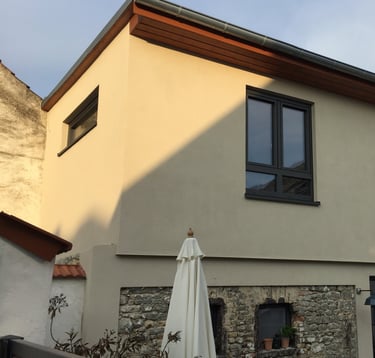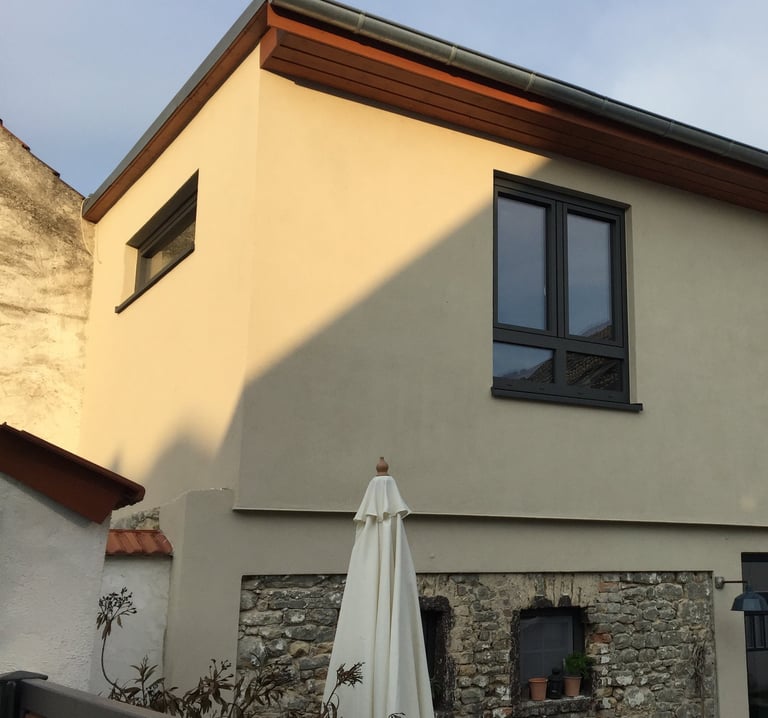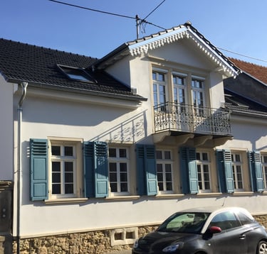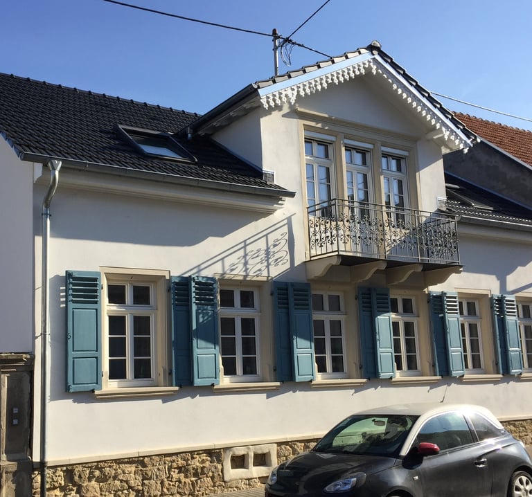 Der südländisch anmutende Altbau mit Eingangsvorbau wurde 2021 komplett saniert und im DG weiter ausgebaut. Der Dachstuhl wurde komplett erneuert und nach KfW-Einzelmaßnahmenstandard gedämmt. Im EG wurde zusätzlich zu neuen Durchbrüchen und Raumerweiterungen der Eingangsvorbau mit vergrößertem Duschbad neu erstellt. Eine neue Fußbodenheizung im EG mit Gas-Brennwert-Technik, neue Fenster und Haustür wurden ebenfalls umgesetzt - die Innenausstattung aller Räume wurde erneuert.