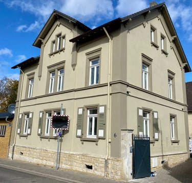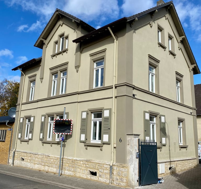 Das große Haus aus der Jahrhundertwende war ursprünglich Wohnsitz einer großen Familie. Die Bauherrin entschied sich für die Aufteilung in 3 Wohneinheiten (EG, OG + DG). Die Baumaßnahme umfasste die komplette Sanierung der Fassaden, den Einbau neuer altbaugerechter Fenster und innen weitreichender Umbau- und Instandsetzungen (Böden, Decken, Wände und Sanitärräume). Aus dem in die Jahre gekommenen Haus wurde dadurch wieder ein ansehnliches Anwesen mit 3 großzügigen Wohnungen.